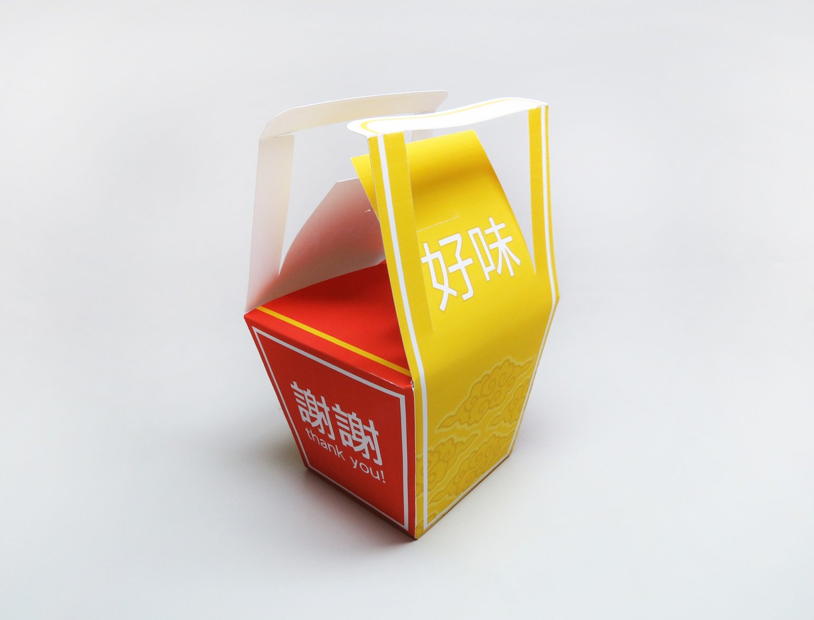 The classic Chinese takeout box design is a folding paperboard container with a wire handle. It’s lightweight, portable, and perfect for small to medium-sized servings. This style is often used for noodles, rice, and fried dishes.