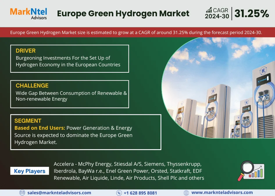 MarkNtel Advisors recently released a research report focusing on the Europe Green Hydrogen Market for the forecast period 2024–30. Employing robust methodologies in the research section, the report offers valuable insights into sales and revenue forecasts 2024 to 2030. This approach enhances user understanding and supports well-informed decision-making. The report comprehensively addresses significant changes, gap analyses, emerging opportunities, trends, industry dynamics, and competitive challenges using qualitative and quantitative data. To familiarize established businesses and newcomers with the present market scenario, the report offers detailed growth prospects for the industry and concise insights into competitors.