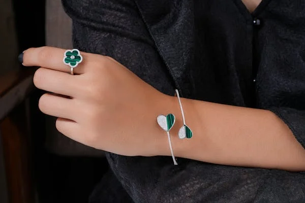 An exquisite and complex gathering is delivered by the blend of a malachite ring and matching earrings. The strong plan of the ring, which is regularly worn on the hand, draws consideration, and the fragile magnificence of the earrings approaches the face. They cooperate to make an entire group that stresses the wearer’s love of both nature and workmanship.